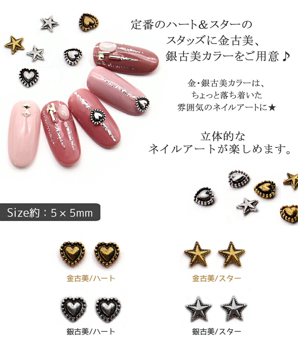 【メタルパーツ】ネイルスタッズ ハート&スター【メール便対応】金古美 銀古美 ネイル アート デコパーツ ネイル用品 レジンクラフト