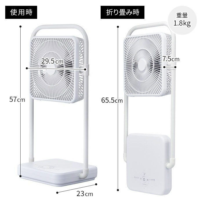 COLOR & SIZE サイズ 使用時:約 W29.5×D23×H57 cm 収納時:約 W29.5×D7.5×H65.5 cm 羽根径:約 19cm、コード長:1.8m 重量 約 1.8kg(本体のみ) 電源 DC15V ACアダプター(付属)/内蔵充電池 内蔵電池 リチウムイオン電池 11.1V 6000mAh(内蔵電池容量)DC15V 連続使用時間 強:約4時間、中:約8時間、弱:約15時間、微弱:約30時間(満充電状態から使用、室温25℃の時) 消費電力 最大13.3W、最小1.16W(50Hz/60Hz) 電気代(1時間あたり) 最大約0.36円、最小約0.03円 機能 風量調節:4段階、タイマー(1・2・4・8時間)、上下風向調節(手動) 保証 お買い上げ日より1年間 扇風機 ランキング